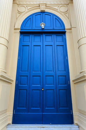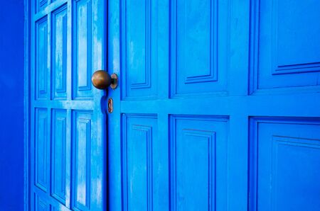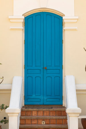 A beautiful old tall wooden door painted blue on a building in the city of Luang Prabang, Laos