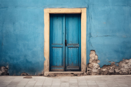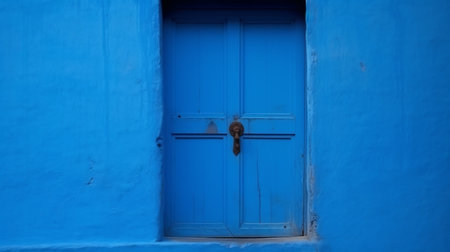 an old blue door stands out between two dark buildings, creating a captivating contrast. this uhd image showcases textured backgrounds reminiscent of the venetian school, with a romantic chiaroscuro effect. the rich color palette, bold chromaticity, and dynamic composition make this photo truly captivating. ai generated