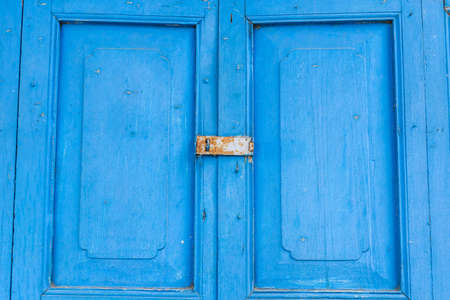 Blue wooden vintage door at an old historic building with plaster wall, Medieval Cairo, Egypt