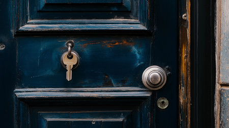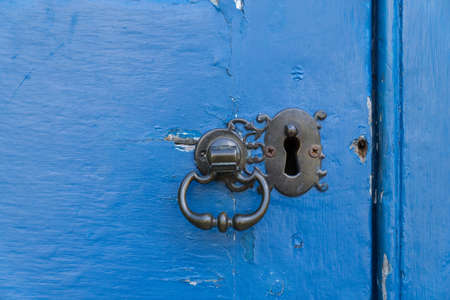a Close up of an old doorknob knocker and a keyhole with a blue painted old weathered door with space fot text copy space