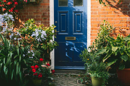 Blue front door and brick walls facade of a Beautiful Cottage with many various potted flowers. The Small garden in front of the house, gardening hobby, create a cozy space around