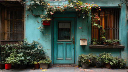 Discover a charming blue house entrance adorned with floral decorations and vibrant greenery, creating a warm and inviting ambiance that emphasizes peaceful living.