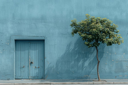 A vertical shot of a white wall with light blue wooden door and plants under a bright sunlight