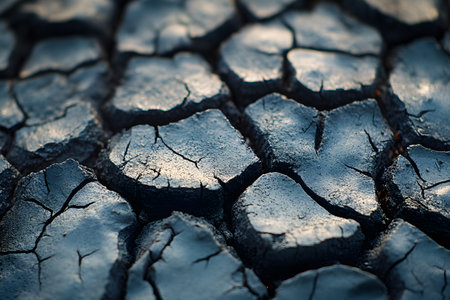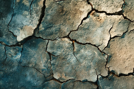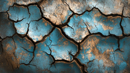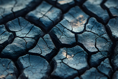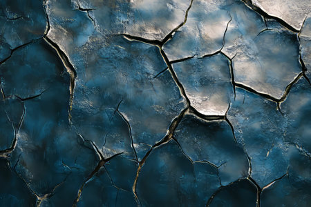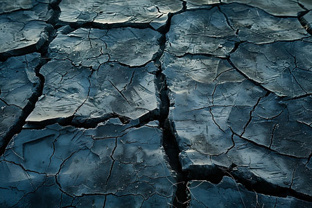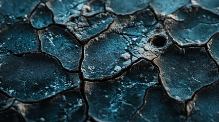Close-up of textured, cracked earth in a unique blue hue. the intricate pattern highlights natural drought conditions and earth's surface details, suitable for environmental themes, design, and backgrounds. Generative AI