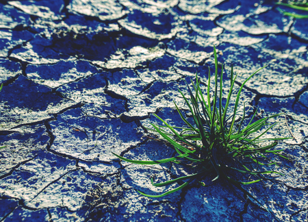 Ground in drought soil texture and dry mud. Green plant sprouts in arid desert, life in the desert