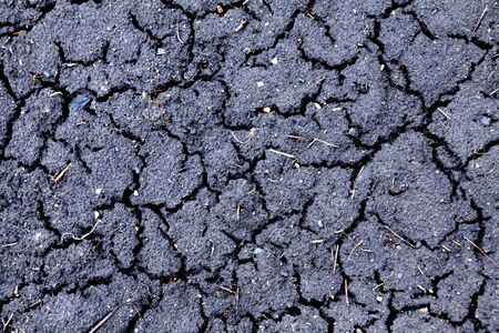 Dark dry soil with cracks. Abstract background. Season without rain. Global warming, climate change and environmental issues affect agriculture.