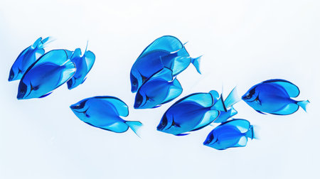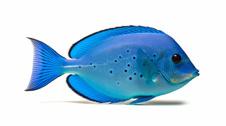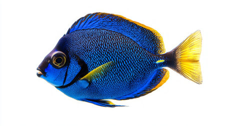Blue Tang fish known for its striking blue and yellow coloration is displayed prominently against a clean white backdrop showcasing its unique features and beauty.