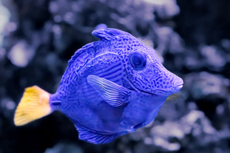 A striking blue fish is captured swimming near coral formations in an underwater environment. The image features a cool color palette with the fish's textured scales contrasting the soft, warm tones of the coral. This composition highlights natural beauty and is suitable for various commercial uses.