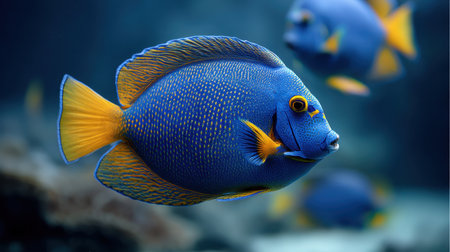 A captivating scene featuring a vibrant blue fish with a striking orange tail, gracefully swimming through clear water surrounded by coral reefs and diverse marine life.