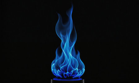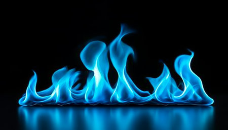 A blue flame burns brightly against a black background