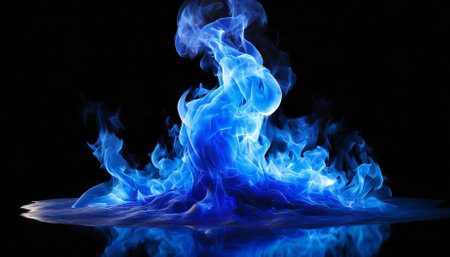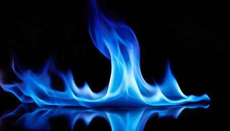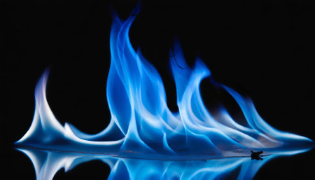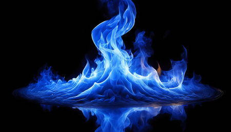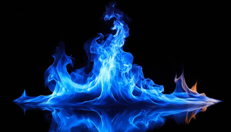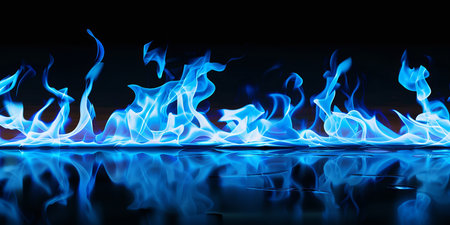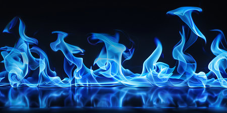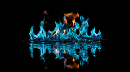 Vibrant Blue Flames Dance on a Black Background, Creating a Striking Visual with Reflection.