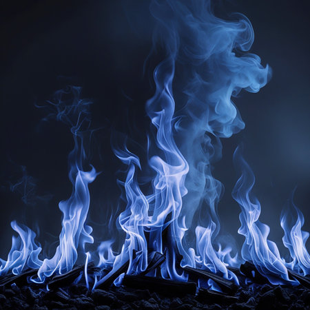 Blue flames dance and flicker in the darkness, casting an eerie glow on the surroundings.
