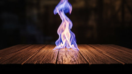 Vibrant blue and pink flames dance dynamically on the surface of a rustic wooden table. The flames exhibit a movement, with ethereal tendrils of cool blue and hot pink light swirling upwards. The textured grain of the dark wood provides a grounding contrast to the energetic and luminous fire. The background is dark and out of focus, all attention to the intense, colorful display of the flames. captures the raw beauty and dynamic energy of fire in an artistic and visually striking manner.