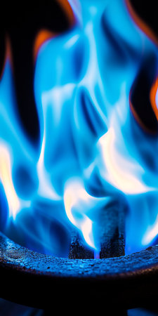 Close up view of a vibrant blue gas flame dancing with hints of orange, providing warmth and light in a dark setting.