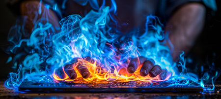Hands Holding Colorful Blue and Orange Flames Burning Bright, Abstract Fire Background.