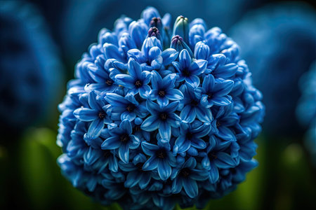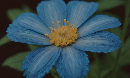 Macro shot of a stunning blue flower with detailed petals against a dark background