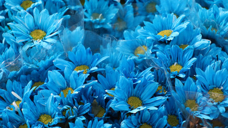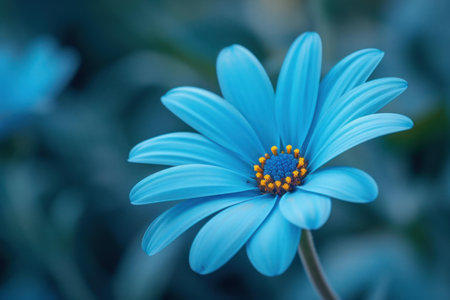 Close-up of a vibrant blue daisy with a yellow center and blurred background, showcasing the colorful petals and natural beauty in a tranquil and serene springtime garden