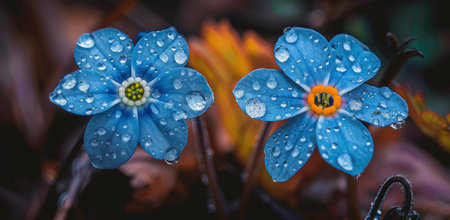 Two blue flowers with water droplets on petals, showing natural beauty and freshness.