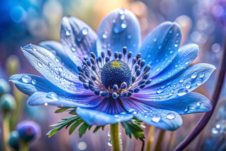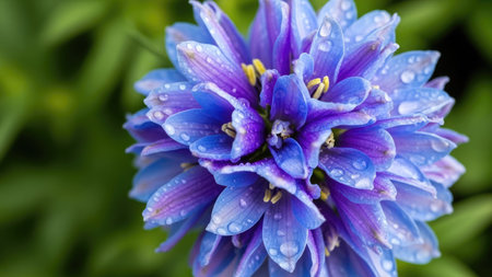 A beautiful bouquet of blue flowers with droplets of water on them. The flowers are a mix of purple and blue, creating a stunning contrast. The water droplets add a touch of freshness