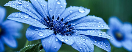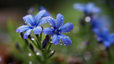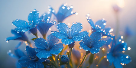 This captivating image showcases vibrant blue flowers adorned with dewdrops, set against a softly blurred background, highlighting tranquility and natural beauty.