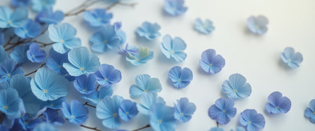A stunning array of delicate blue flowers is beautifully scattered across a serene, light backdrop, creating a tranquil and inviting atmosphere. Each petal, with its subtle gradients of blue, evokes feelings of calmness and serenity, making this image perfect for themes of nature, beauty, and peace.