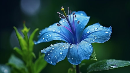 A macro shot of a striking blue flower with energetic pollen stems radiating beauty and vitality.