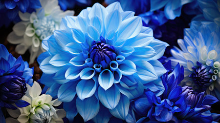 photograph blue dahlia illustration garden flower, greenery vibrant, ruffled charming photograph blue dahlia