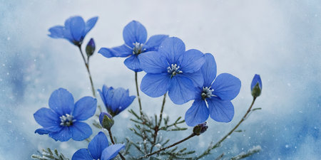 A close-up image of blue flowers adorned with delicate frost, showcasing intricate ice crystals on the petals. A stunning representation of winter's beauty.