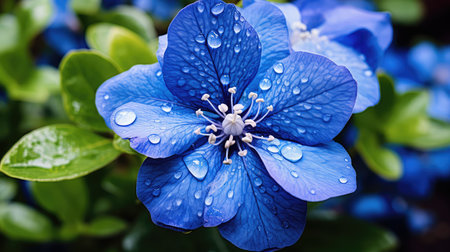 Vivid blue flower displaying raindrops on petals in a vibrant garden, showing nature's beauty after a refreshing rain.