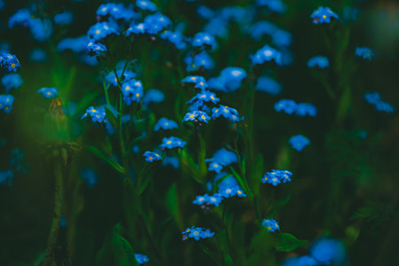 A top view of the beautiful blue flowers of forget-me-nots, growing in the twilight of a summer evening, surrounded by nature.