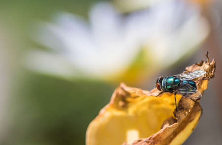 Close up of fly or bluebottle eating dried fish