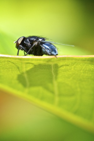 Blowfly, carrion fly, black fly sitting on a green leaf close up. natural background.