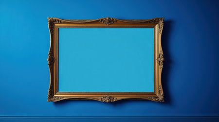 Ornate gold frame on a blue wall. Perfect for showcasing your art or design. Empty space ready for your content.