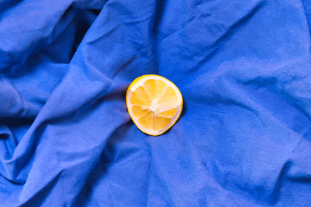 Minimal composition with lemon slice on serenity blue fabric. Creative sailing concept. Isometric view