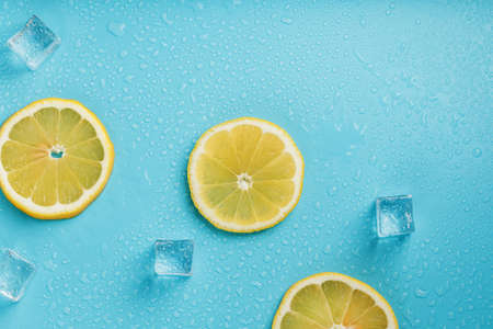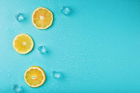 juicy fresh lemon slices and ice cubes on a blue background. Top view, flat lay. Banner.