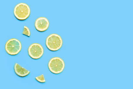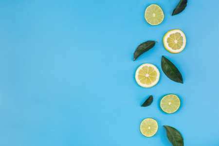 Above view at cutted lemons and limes on blue background