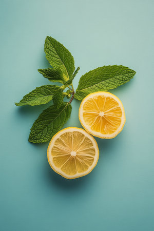 Refreshing Citrus Drizzle: A Vibrant Summer Composition Embracing Lemon and Yellow Flower Petals against a Lively Blue Canvas