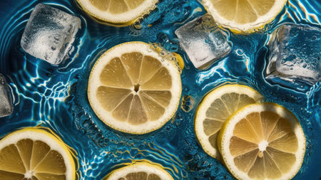 lemon slices on blue background with ice cubes