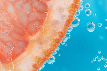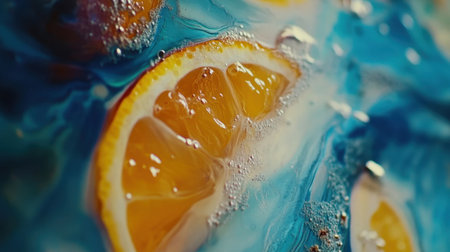 Abstract art featuring a close-up of colorful orange slices immersed in vibrant blue textures with bubbles, creating a dynamic and cheerful visual experience perfect for modern decor.