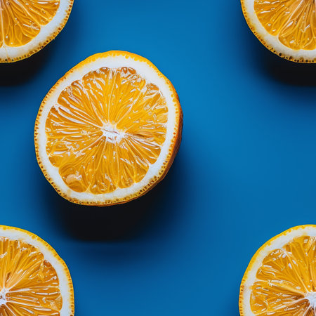 Juicy orange slices on blue background, scattered for an eye-catching display. Adds color to designs, perfect for food, fruit, health, tropical themes. Ideal for patterns, prints, web graphics.Pattern@240807_