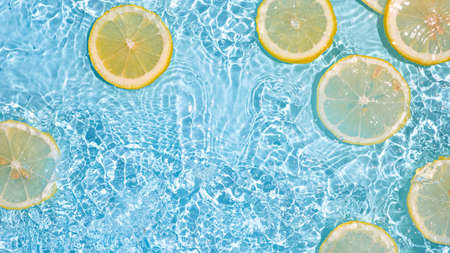 Lemon slices in clean transparent water over blue background with copy space. Water splashing on blue water surface in sunlight. Top view or flatlay. Summer, vacation, healthy eating concept. Banner