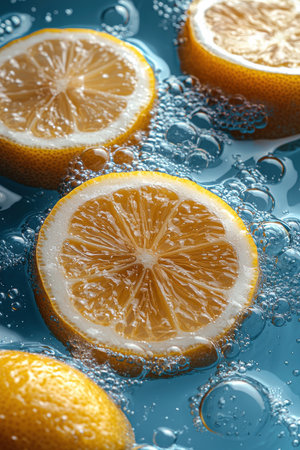 Fresh lemon slices surrounded by bubbles in bright clear blue water