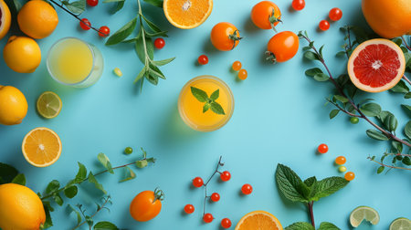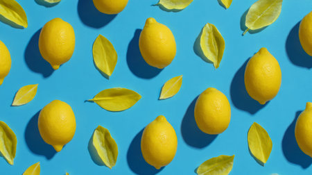 Overhead citrus design with lemons and yellow petals arranged symmetrically on vivid blue backdrop, modern minimal summer stock style