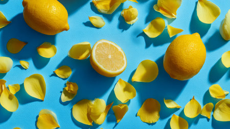 Vivid citrus summer composition of lemons and scattered yellow petals, artistic flat lay on bright blue backdrop, modern minimal stock photo