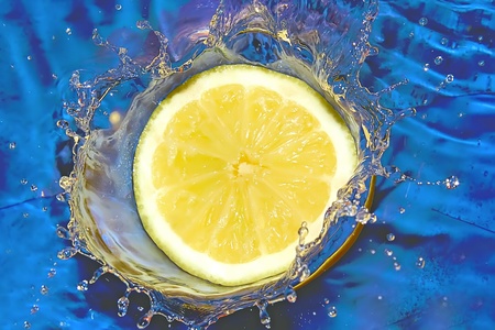 Splash with fresh lemon. Pure water. Blue background.