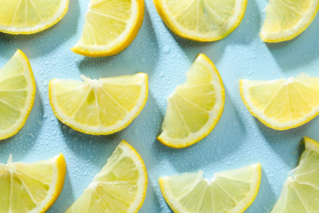 Fresh lemon slices on blue background.