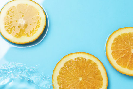Fresh orange slices with water splash on a blue backgound. High quality photo