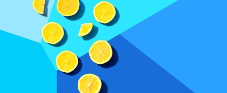 Slices of lemon on blue background. Citrus frui