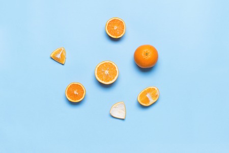 High vitamin C, Juicy and sweet. Fresh orange fruit on blue background. Top view