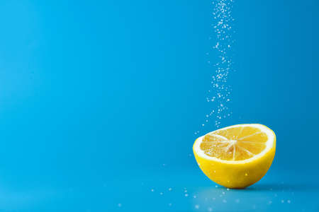 Sprinkling of sugar onto fresh lemon against color background